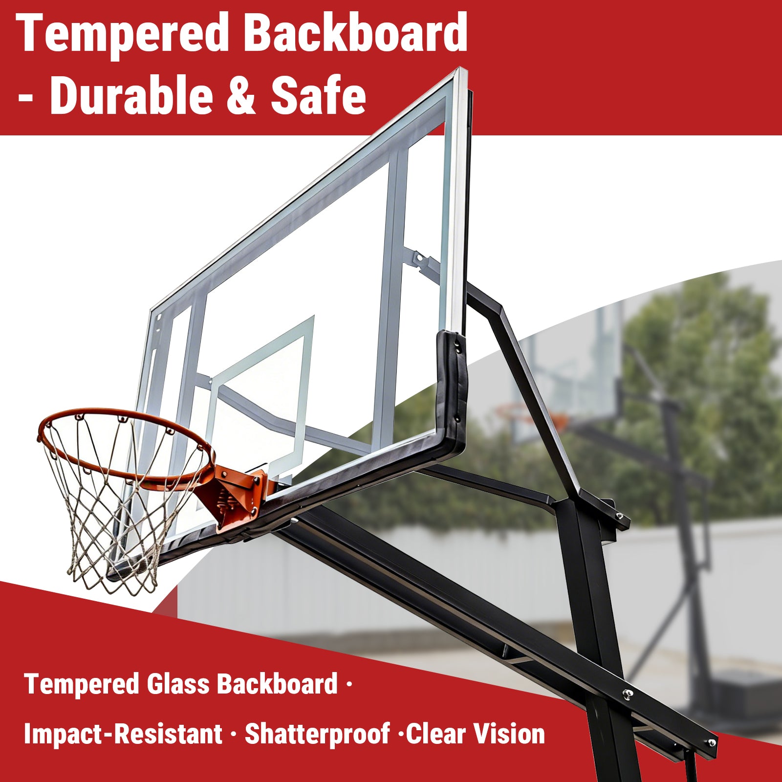 Frame: High-quality steel construction with reinforced welding, powder-coated finish, and built-in safety padding at critical jointsBackboard: Shatter-resistant polycarbonate (or tempered glass, per model) โ clear visibility, consistent reboundWheels: Dual heavy-duty casters for effortless mobility โ move indoors/outdoors in secondsUniversal Use: Perfect for driveways, patios, gyms, parks, schools, and backyardsQuick Setup: Fully assembled out of the box โ ready to play in minutesDurability: Engineered for long-term outdoor/indoor use โ rust-resistant, UV-stable, and impact-tested