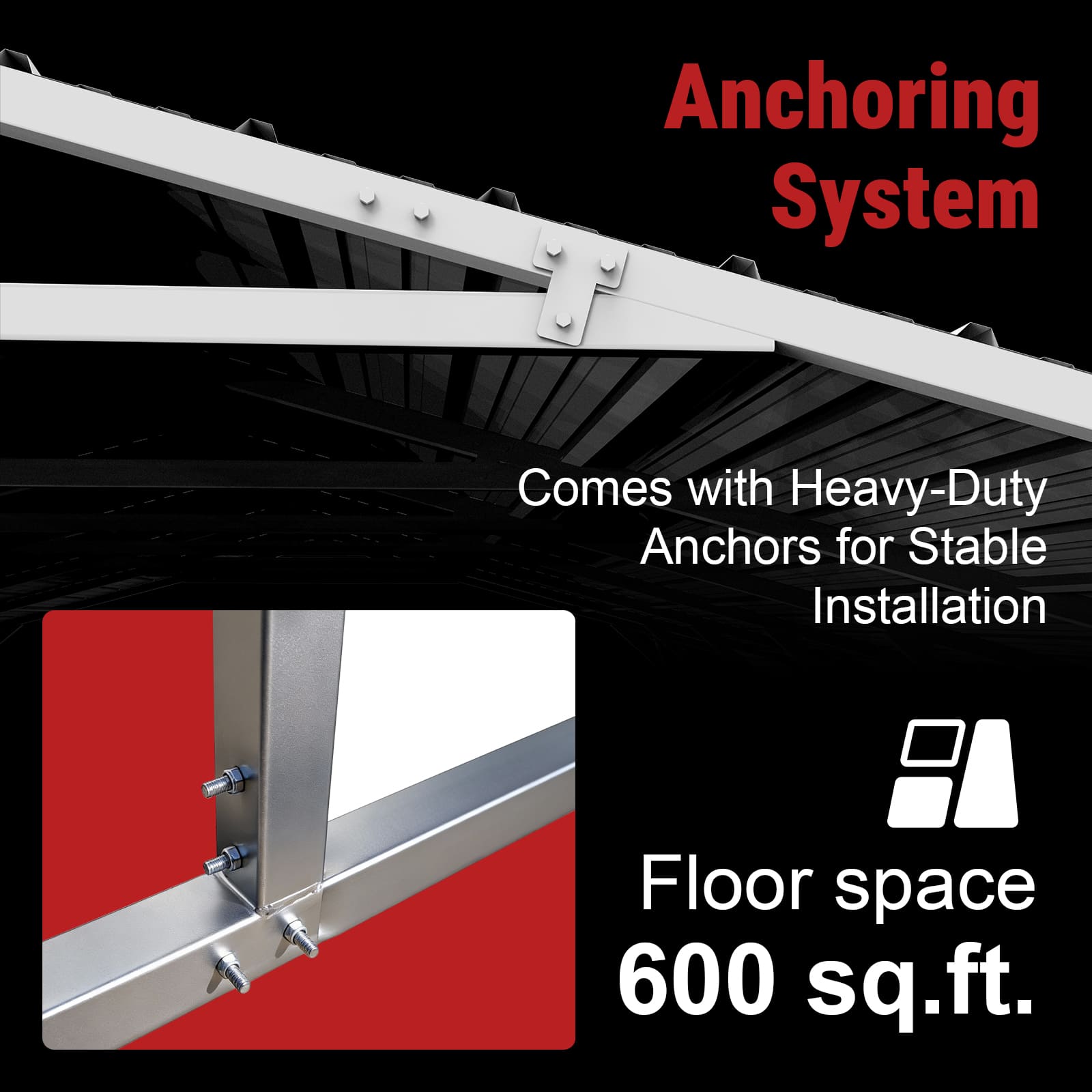 • Assembled size: 30FT (L) × 20FT (W) × 14FT (H); approx. 600 sq.ft. floor space