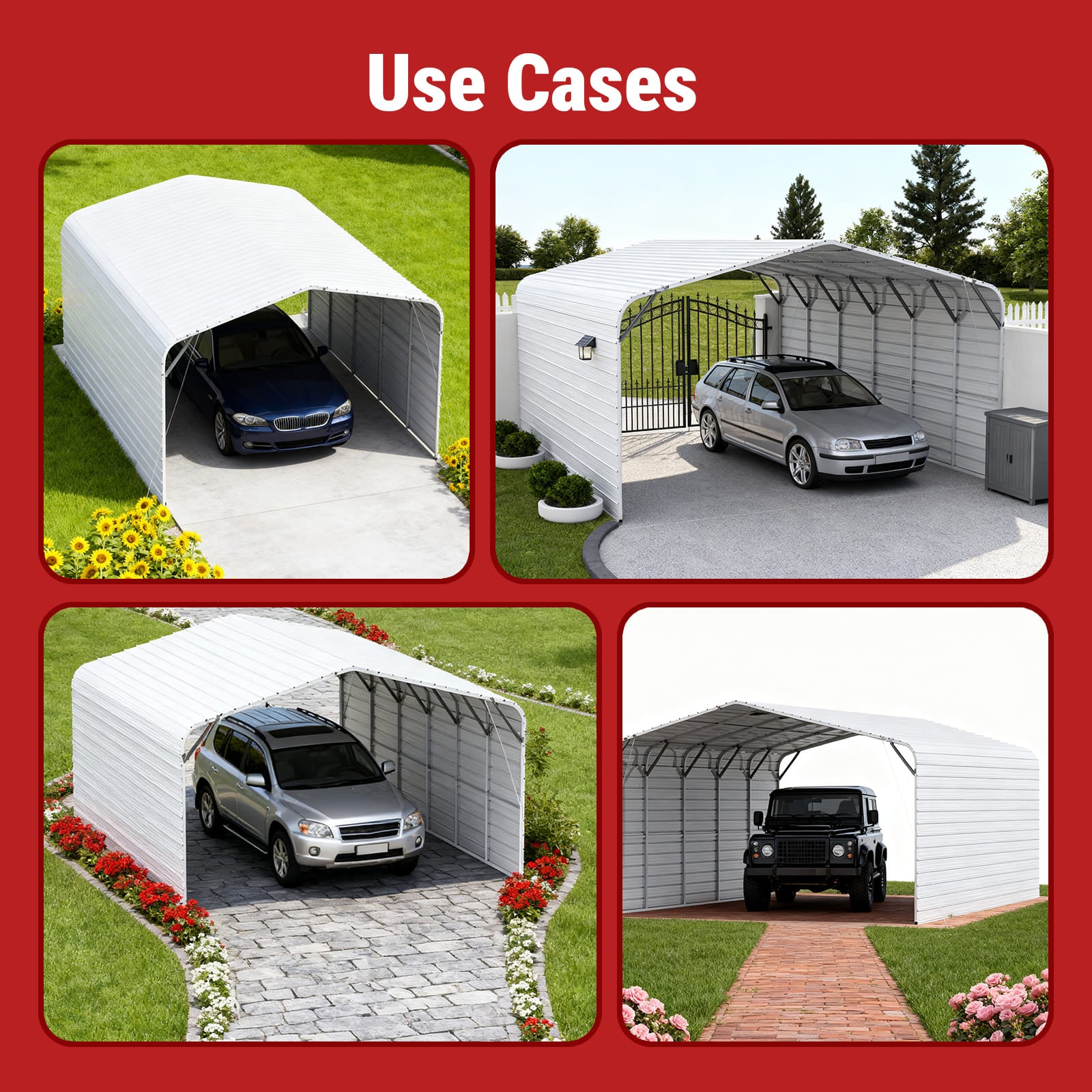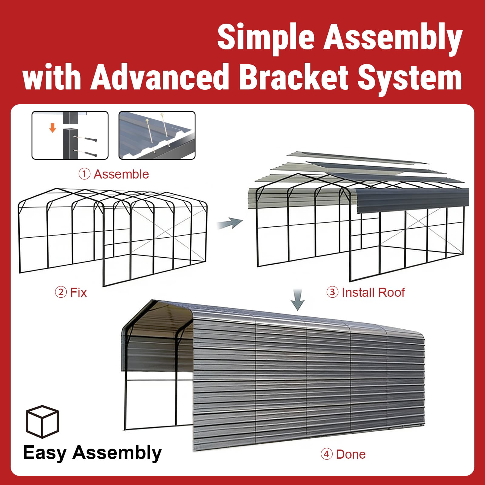 Ideal for use as a metal garage, steel carport, or equipment storage shed. This all-weather steel structure protects cars, motorcycles, garden tools, and machinery, offering reliable year-round shelter for home, farm, or workshop use.