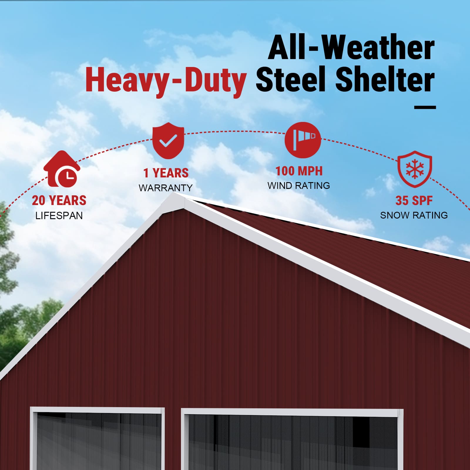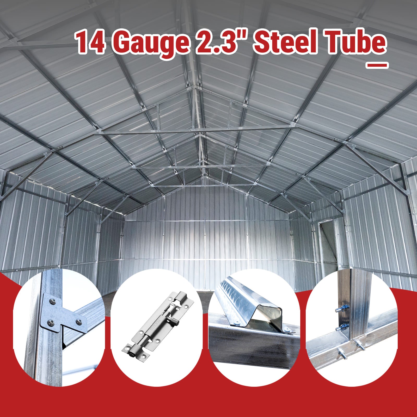 The 14-gauge steel frame and reinforced roof provide strong structural integrity, giving it a long 15–20 year service life. Its large interior space, durable sheet metal panels, and included concrete anchors make it a reliable, long-term storage solution for homeowners, contractors, and businesses needing secure outdoor storage.