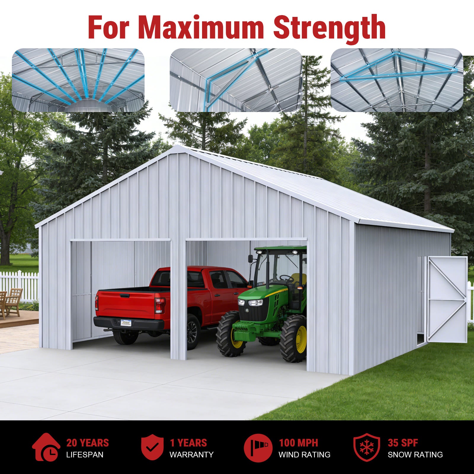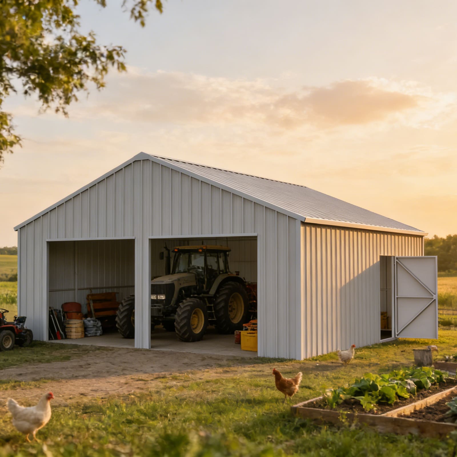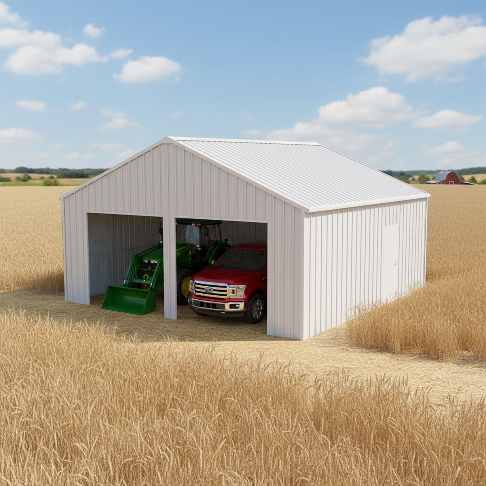 Perfect for use as a double garage, steel barn workshop, or farm equipment storage shed. This metal structure provides secure, long-lasting protection against weather, ideal for residential, agricultural, or industrial setups.