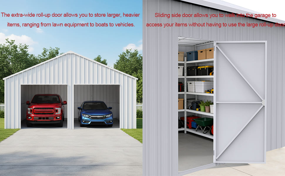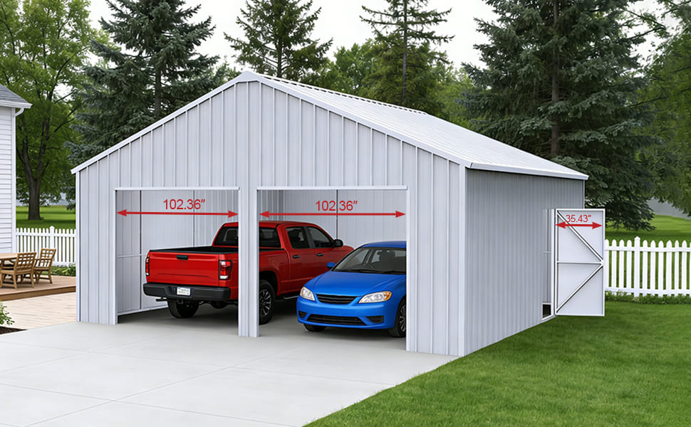 The 25FT × 33FT Double Garage Steel Barn Shed offers spacious, all-weather storage for vehicles, machinery, and equipment. Built with 14-gauge galvanized steel and reinforced roof panels, it ensures durability, strength, and a clean, professional look for home or commercial use.