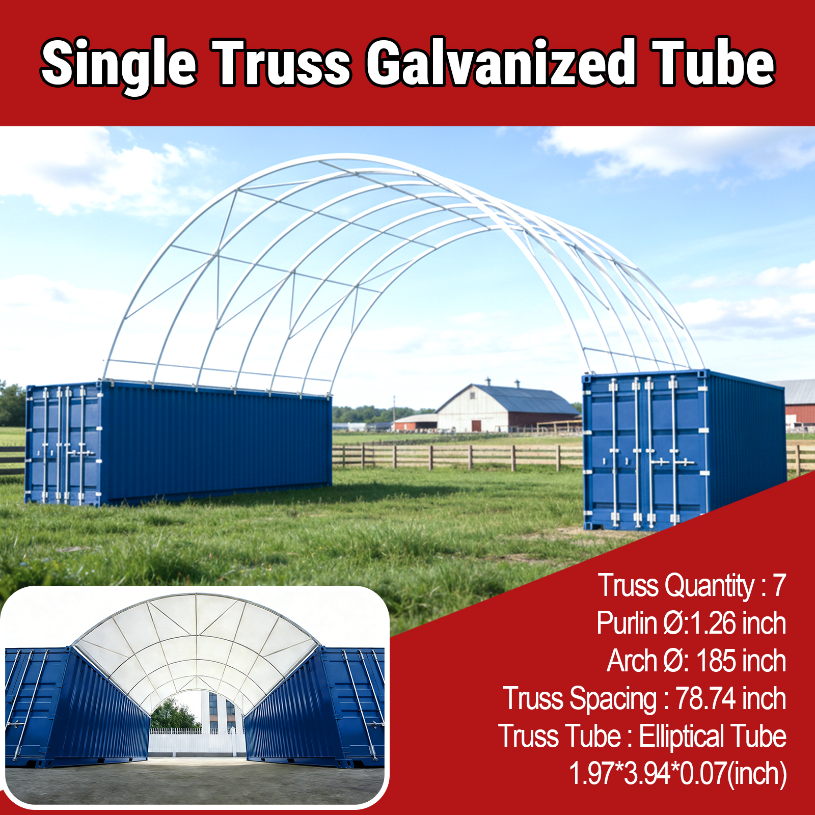 - Optimized Frame: 7 single trusses made from galvanized steel (Purlin Ø: 1.26″, Arch Ø: 185″), spaced at 78.74″ intervals — engineered for stability, ease of assembly, and reduced shipping volume