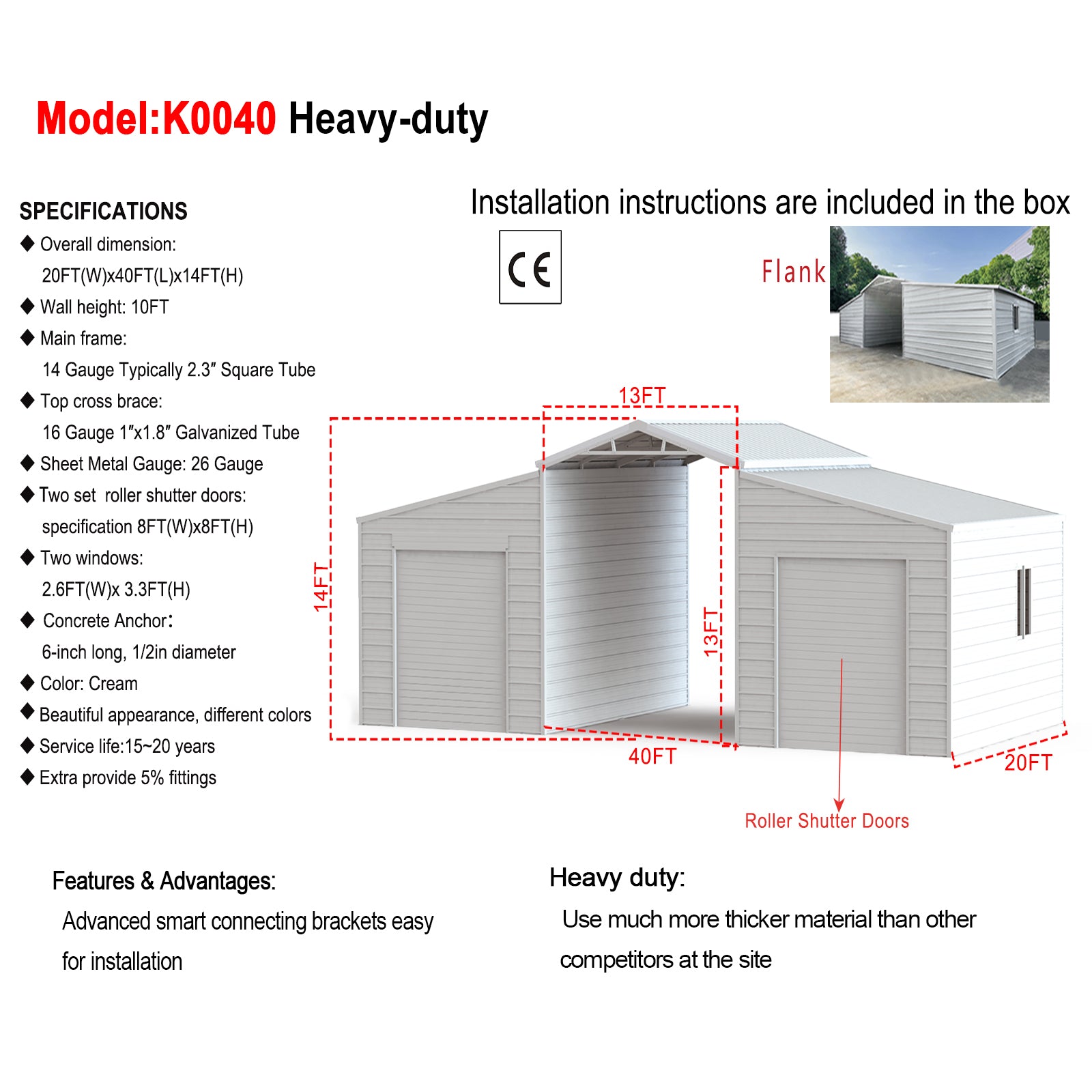 - Spacious 20FT × 40FT × 14FT design with 10FT wall height