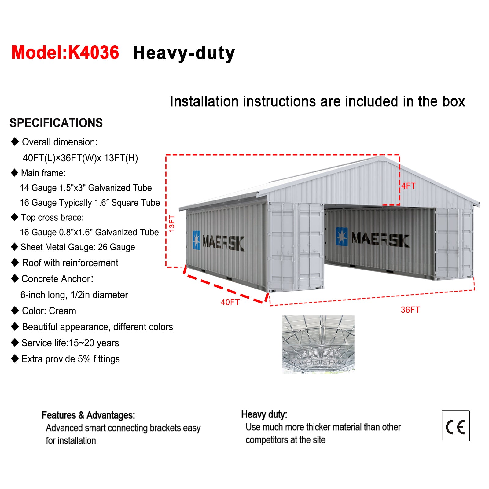 - 40FT (L) × 36FT (W) × 13FT (H) overall dimension