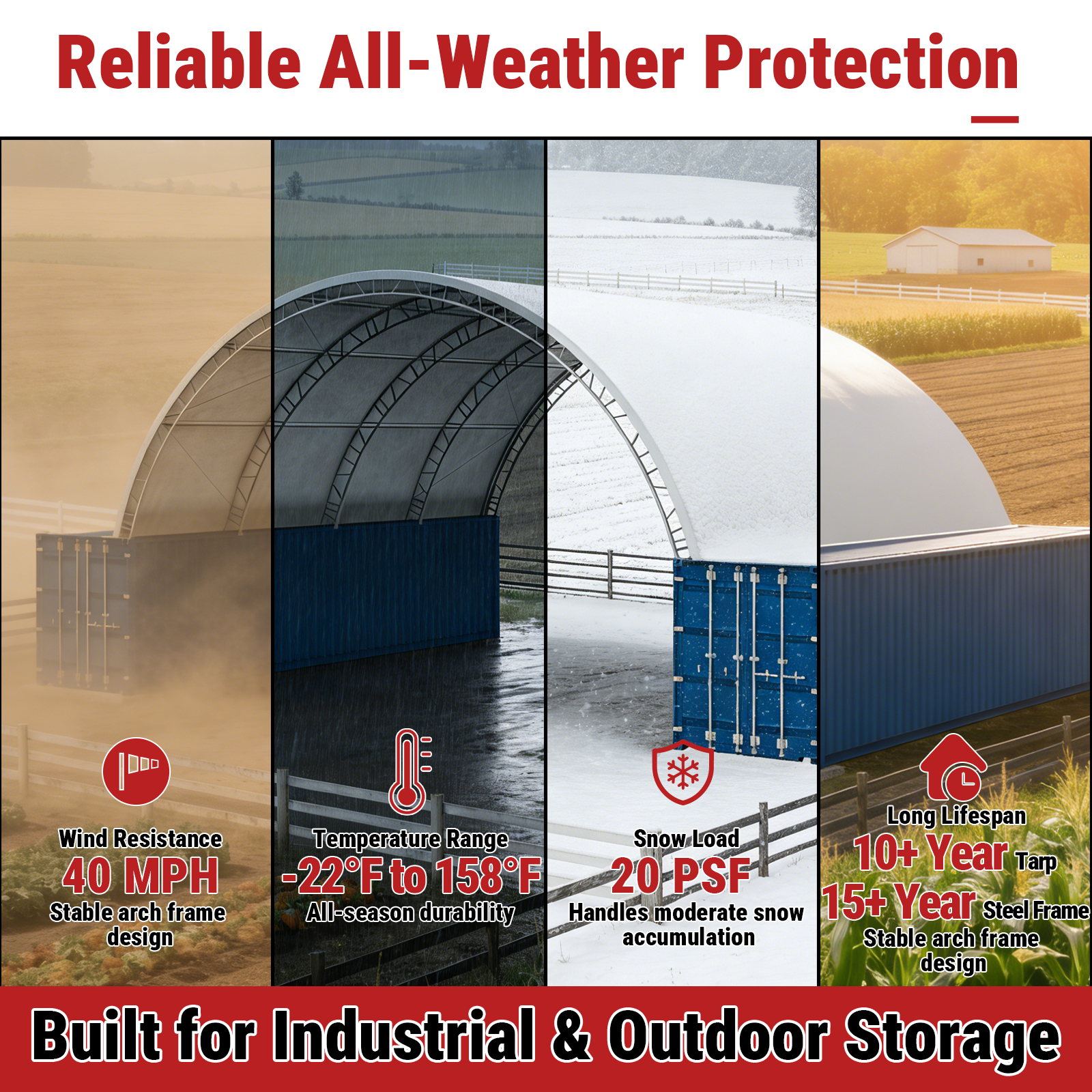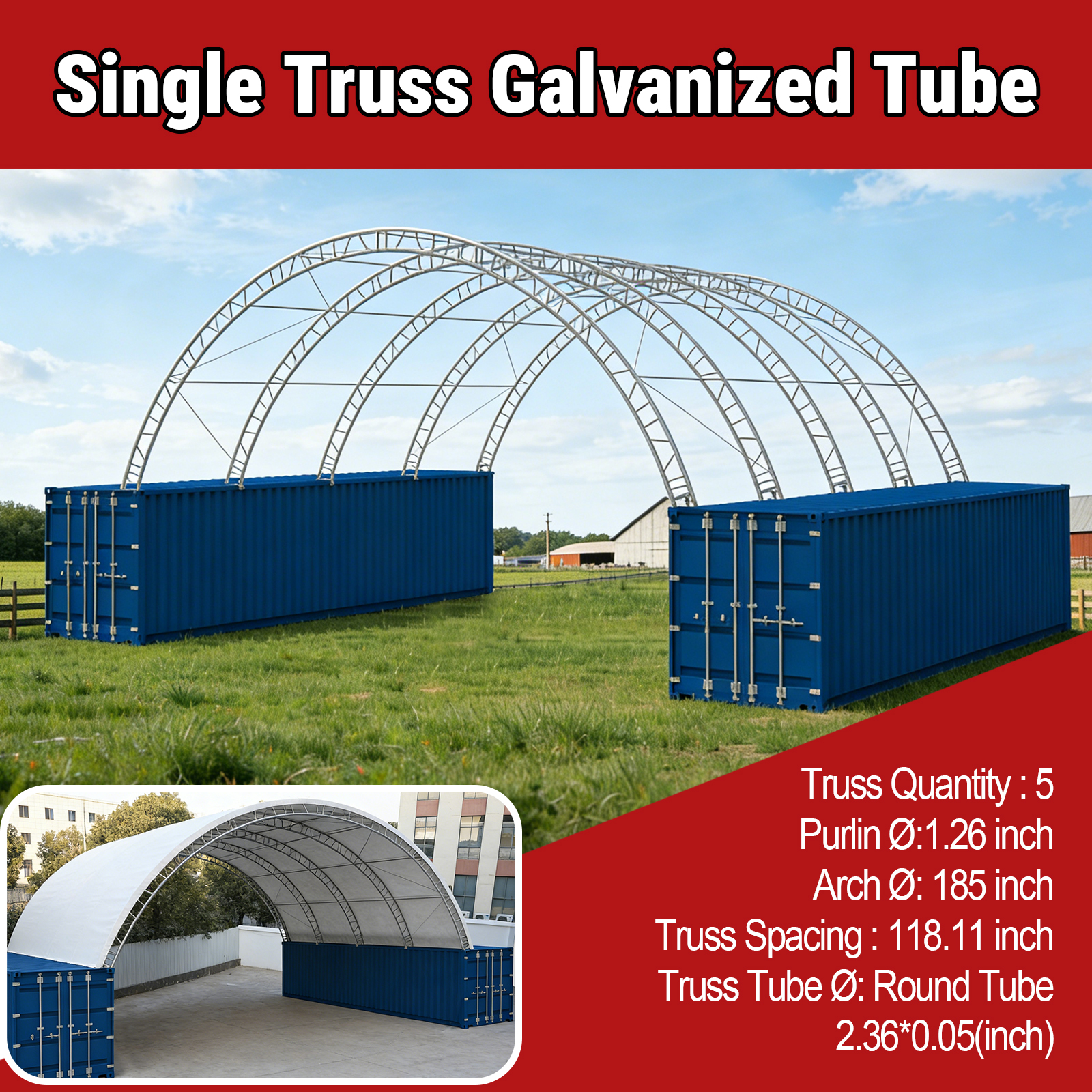 - Stable Frame: Single truss galvanized steel tube (Ø 1.26″ purlin, Ø 185″ arch), 118.11″ truss spacing — engineered for 40 MPH wind resistance and 20 PSF snow load
