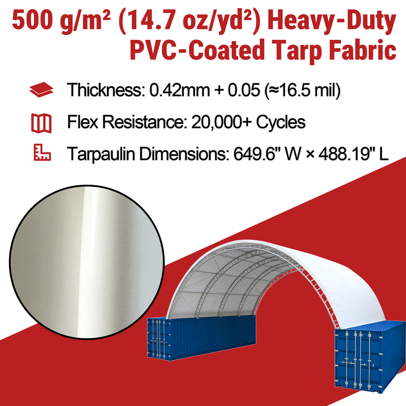 - Superior Fabric: 500 g/m² heavy-duty PVC-coated tarp — 0.42 mm + 0.05 mm coating (~16.5 mil), 20,000+ flex cycles, UV-stabilized, fire-retardant, mold/mildew resistant