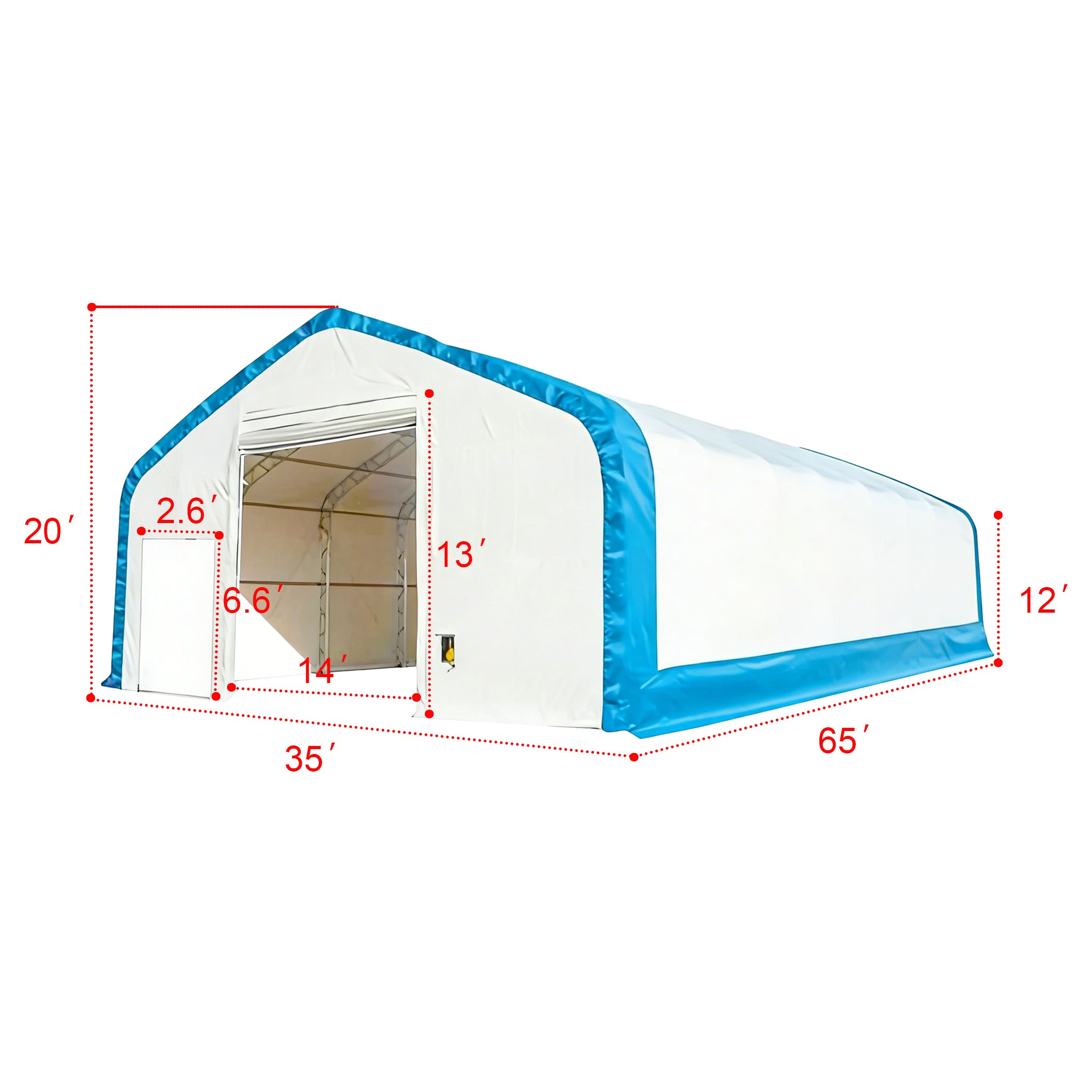 • 1 × Side personnel door: 2.6 FT (W) × 6.6 FT (H) — zippered or hinged