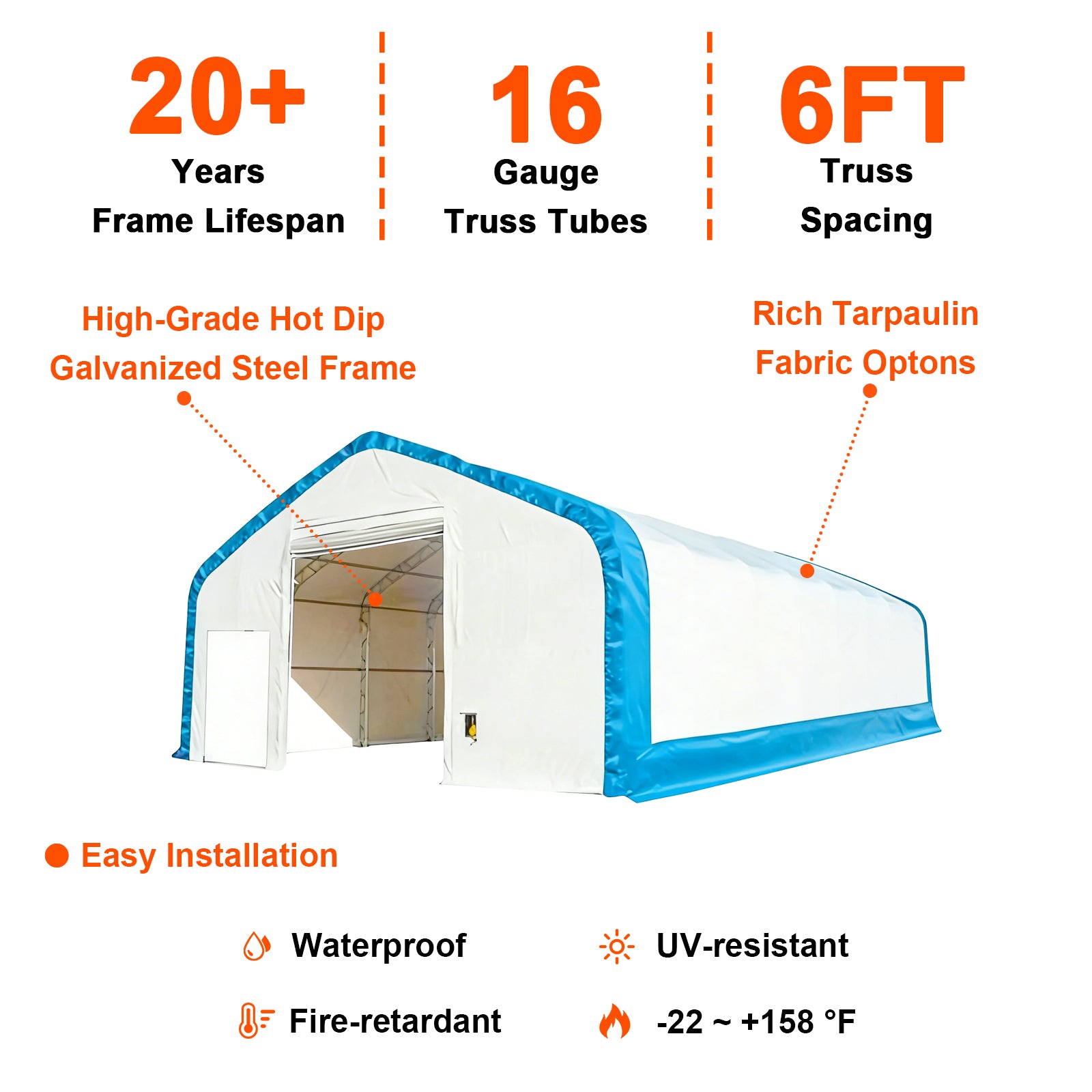 • Frame construction: Double-truss design with 16-gauge hot-dip galvanized steel tubing; 6 ft truss spacing for enhanced stability and load distribution